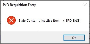 Now, when we save the data on the grid, on PO Requisition Entry screen a message will pop up saying that the item “TRD-B/SS” is an inactive item, refer below figure 3.