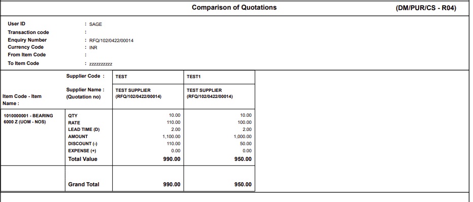 In the above RFQ entry, we’ve two suppliers giving 1 response for the product. So our report will be reflecting the different parameters based on the response data per supplier.