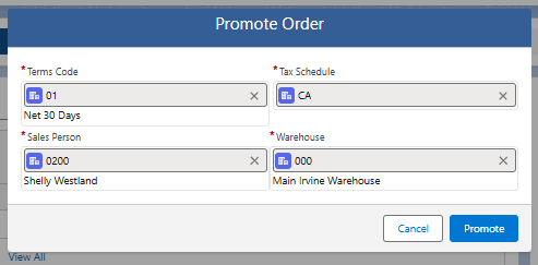 When promoting orders to Sage 100, you’ll see an additional Promote Order modal. Please enter the required information before proceeding with the promotion.