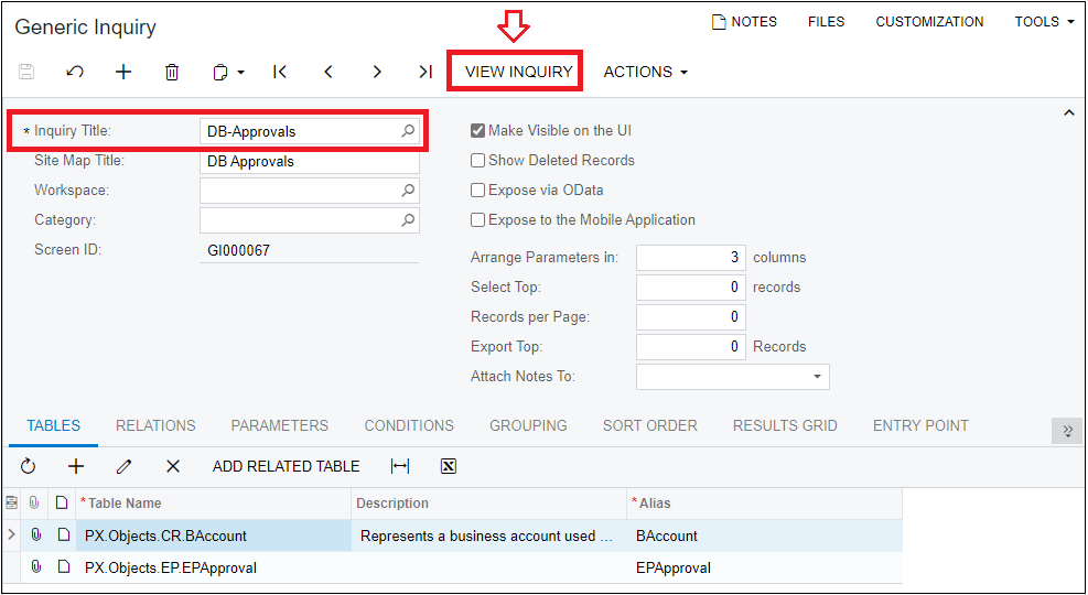 Step 3: Save the changes and click View Inquiry action on Generic Inquiry screen.