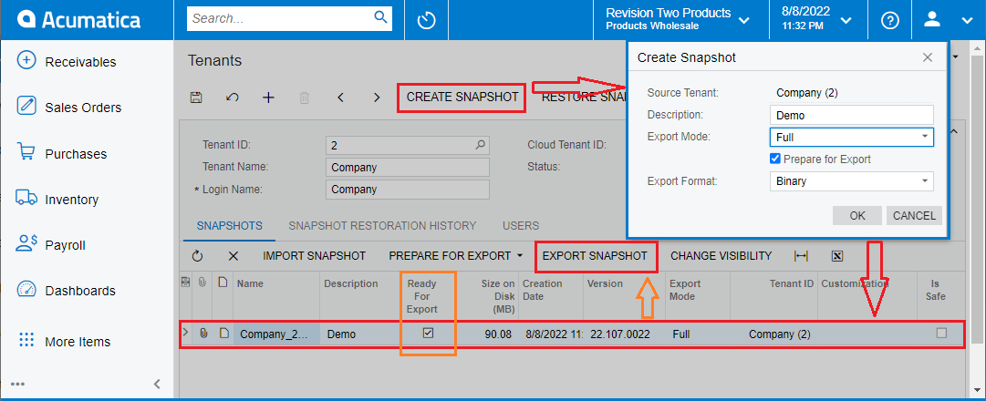 Acumatica ERP provides a simple to use functionality to quickly copy the complete or partial data of the company and make it available elsewhere to have a cloned system. This is achieved by creating a snapshot and restoring the snapshot to an instance of Acumatica.