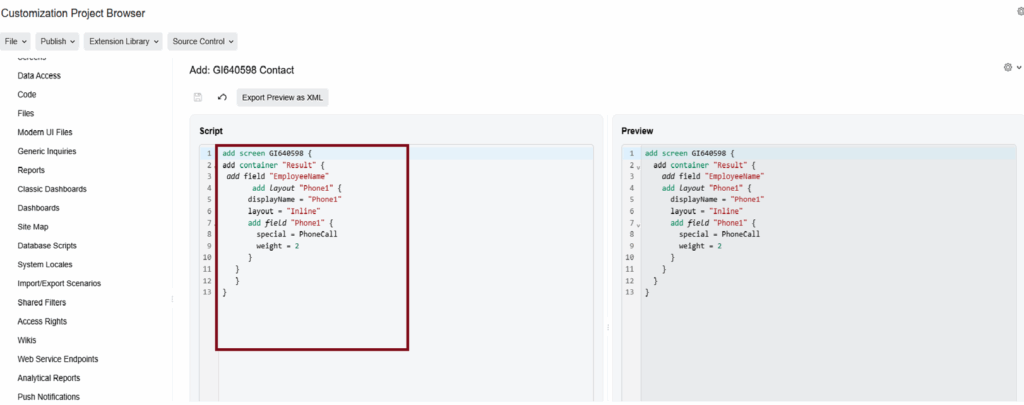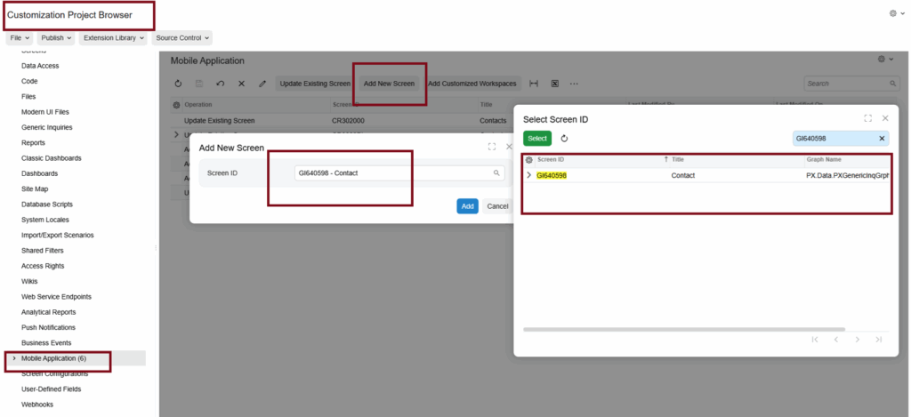 Open the customization project. Go to Mobile Application, click Add New Screen, and paste the required code for the call action. Publish the project once more.