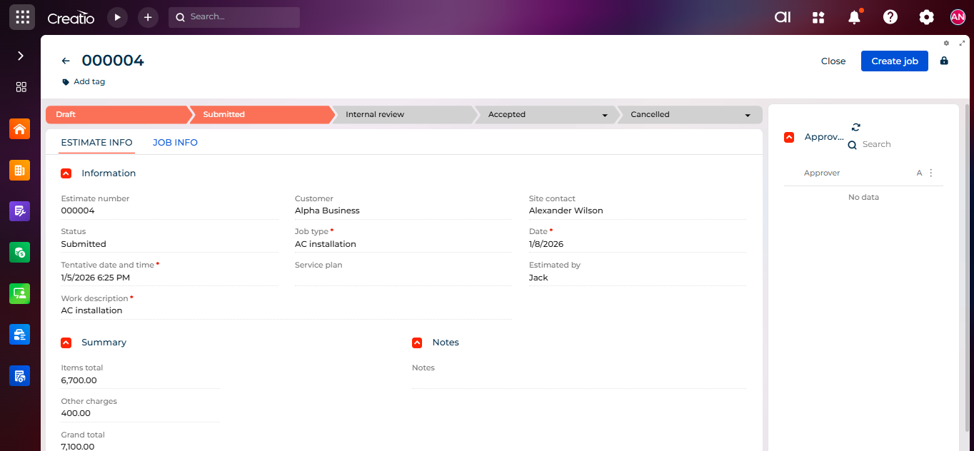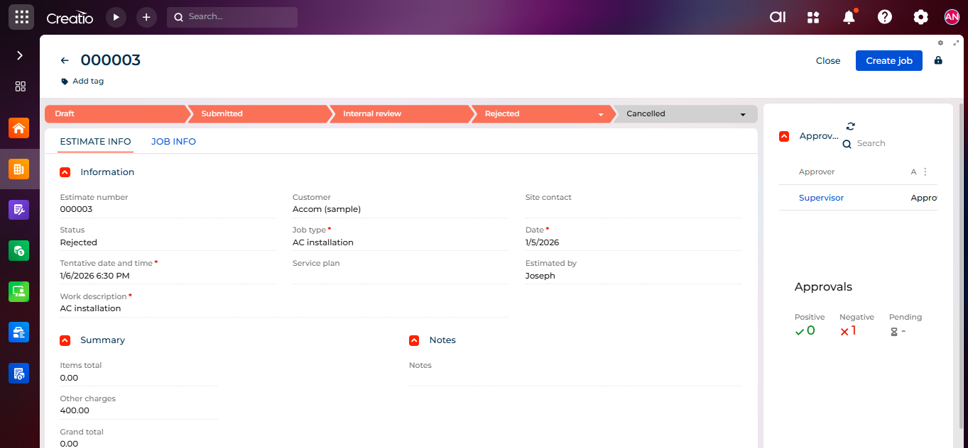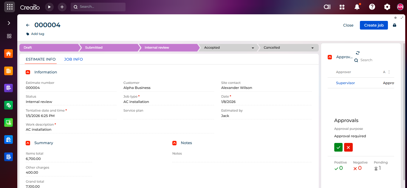 Setting up an approval process in Creatio helps make your workflow smoother and more organized. Managers can easily review and approve estimates, while field engineers can work confidently knowing their submissions are properly tracked. This ensures transparency, saves time, and improves overall efficiency.