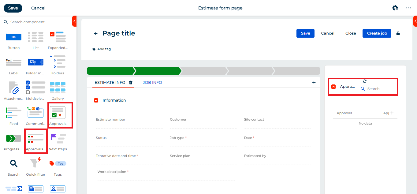- To provide better visibility of approvals, add the preconfigured elements Approval list and Approvals to the form page. Simply drag and drop them from the components panel. Since these are preconfigured elements, no additional configuration is required. Click Save. Refer below: