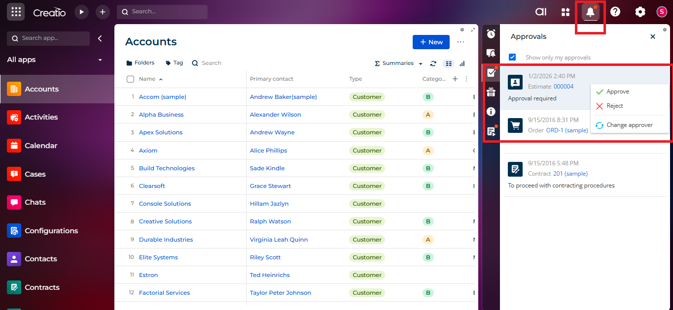 Approval processes have always been an essential part of business hierarchies. While higher management is typically responsible for making key decisions and granting approvals, operational tasks are handled by lower management. As a result, seeking approval becomes a routine and integral part of business operations. Creatio simplifies this workflow by making approval processes easy to configure and manage.