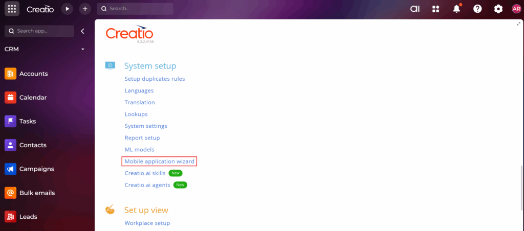 Log in to Creatio with administrative privileges and navigate to System Setups. From there, open the Mobile Application Wizard.