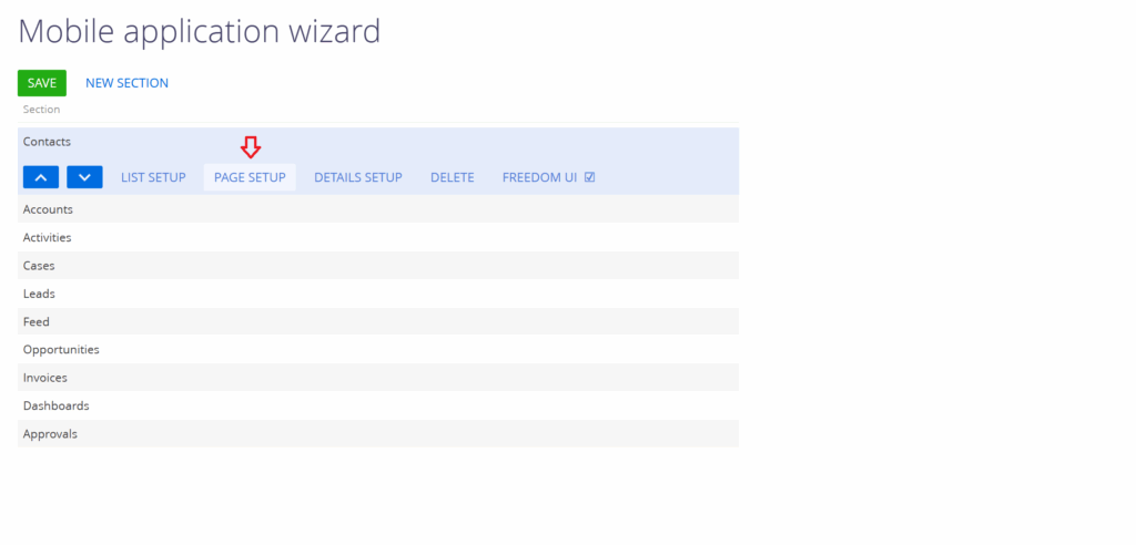 Once the section is selected, click on Page Setup. This option allows administrators to configure the page layout as it appears in the mobile application.