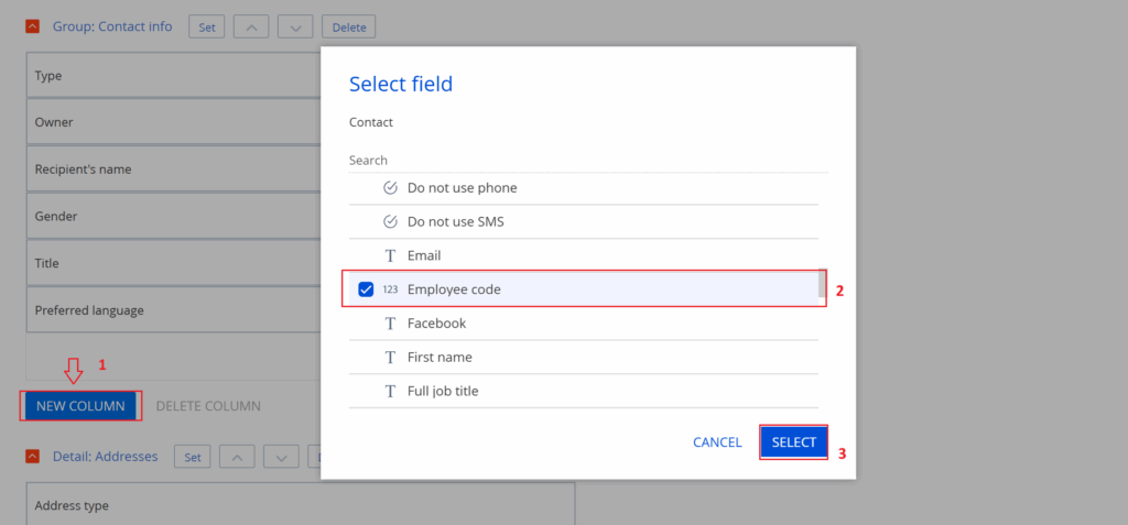In the Contacts section, an existing field like Employee Code can be added to the Contact Info block so that mobile users can easily view it when opening a Contact record.