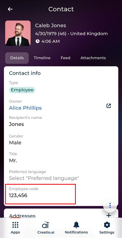 The Employee Code field should now appear in the Contact Info section, confirming that the field has been successfully added to the mobile layout.