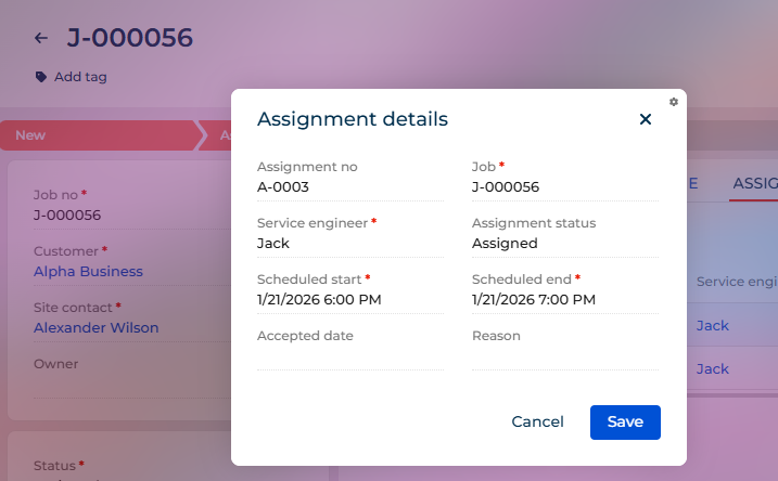 Now, whenever a user creates a new assignment and asassigns it to service engineer and clicks Save, an email will automatically go out to assigned service engineer. To demonstrate. I have created an assignment (A-0002) against a job number(J-000056) and assigned this assignment to Jack. Refer below: