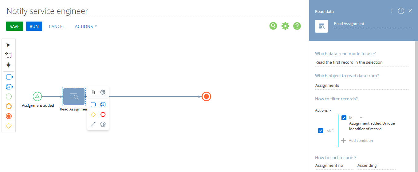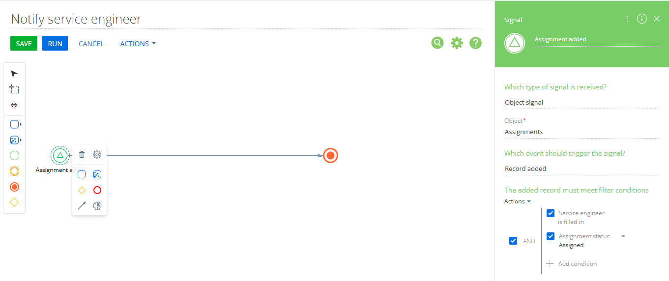 - Give a meaningful name to your process and as we are sending mails on event that is when new assignment is created and assigned to service engineer, change the starting point to signal instead of simple. To do the same click on the circle, you will get the small panel with different icons, click on gear icon and select signal(Circle with triangle icon)from that panel. Set up the element as shown on right hand side.