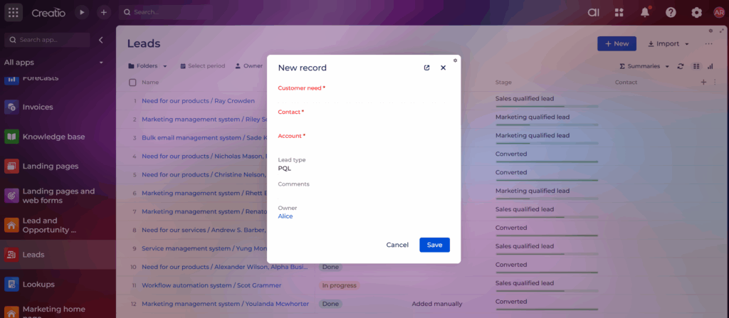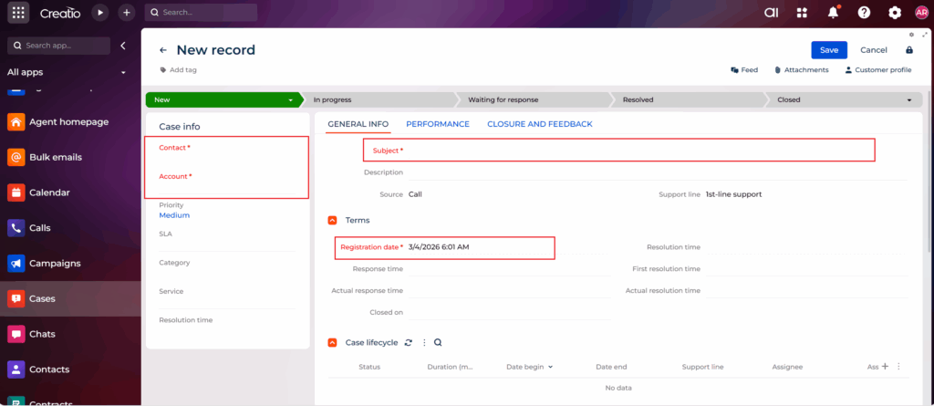 Save the changes and refresh Creatio CRM. Now all mandatory fields across all sections will be highlighted in red. Navigate to any section (Cases, Accounts, Contacts, Leads, etc.).