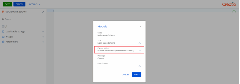 4. Set Parent Object = MainHeaderSchema and click on Save.