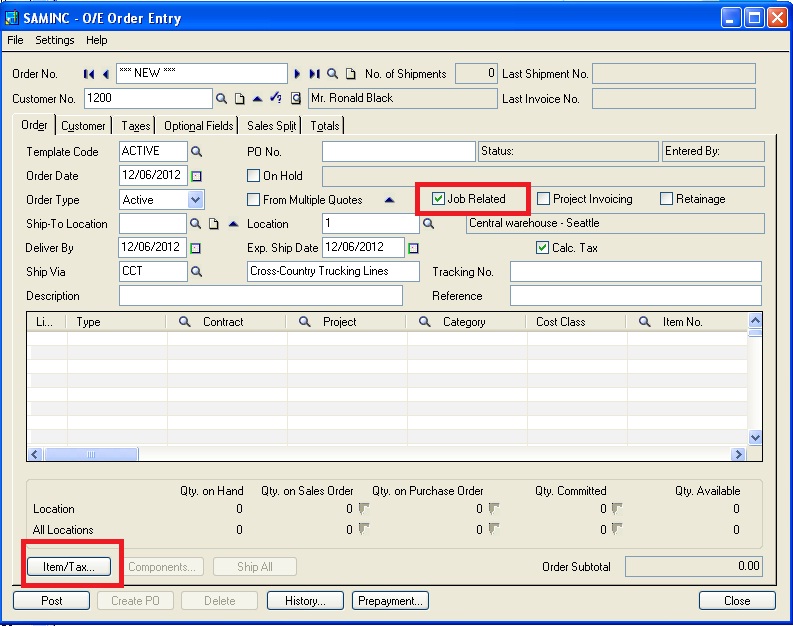 To create Jobs related to Orders in Sage 300 ERP, follow below mentioned steps;