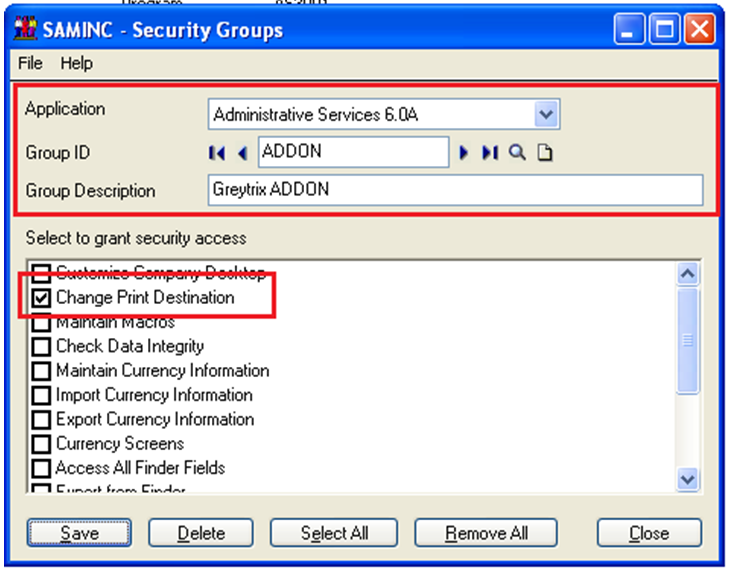 2. In Security Groups select Application as Administrative Services and check Change Print Destination icon.