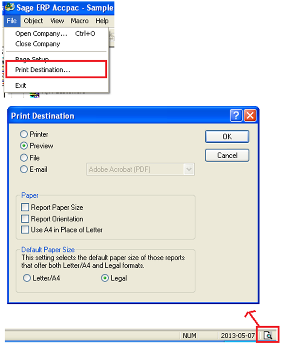 3. Now re-login to Sage 300 ERP with user ADDON, and check for File menu header and left bottom, double click on highlighted icon [below], Print Destination screen would popup.