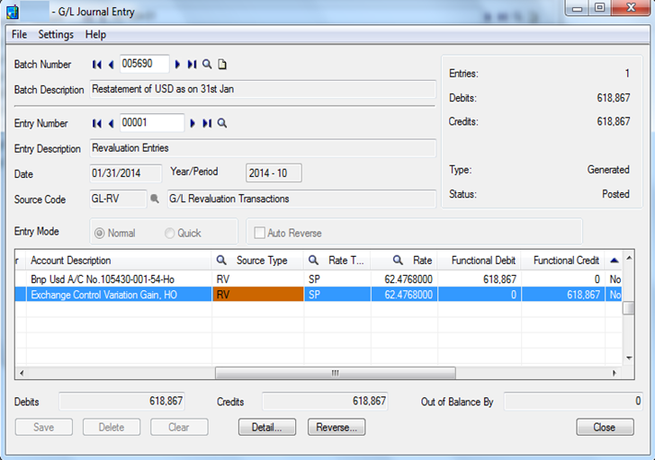 For example, as we can see in below screen shot, we have passed a G/L Revaluation entry as on 31st Jan 2014 in 537004-01(BNP USD Account)” with exchange rate 62.4768