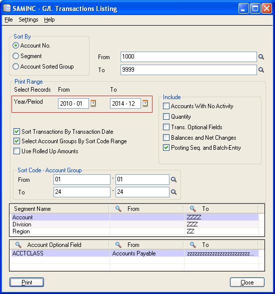 In the earlier version of SAGE 300 ERP, users had an option to print records only for one Fiscal Year/Period at a time. To make it more comparable SAGE has enhanced the feature to provide a ‘From’ and ‘To’ range of Fiscal Year and Period.