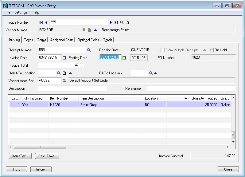 Here is the converted Purchase invoice of Sage 50 CAD into Sage 300 ERP (refer below screen shot) where the Invoice Transactions has been converted as per the mapping.
