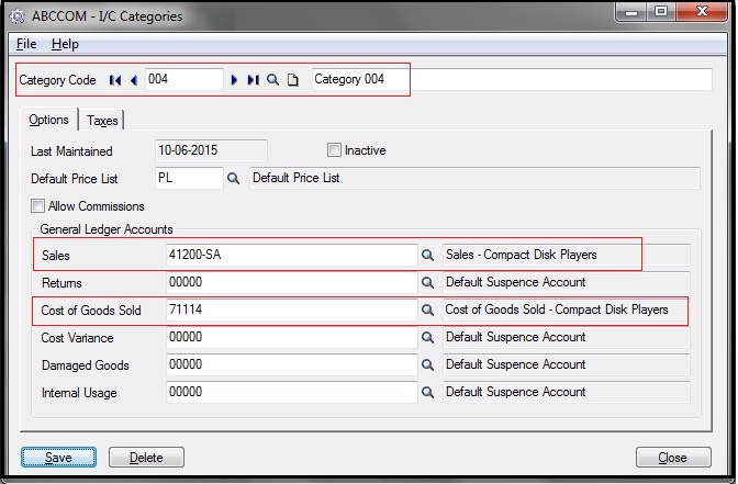 ”G/L Acct” of Sage Business Vision is assigned in IC category as: “Sales Account of Sage Business Vision is assigned as “Sales” and “Cost of Goods” is assigned as “Cost of Goods Sold” in Sage 300 ERP (Refer Below screenshot).