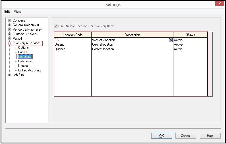 Sage 50 (CAD) –> Inventory & Services –> Settings –> Locations