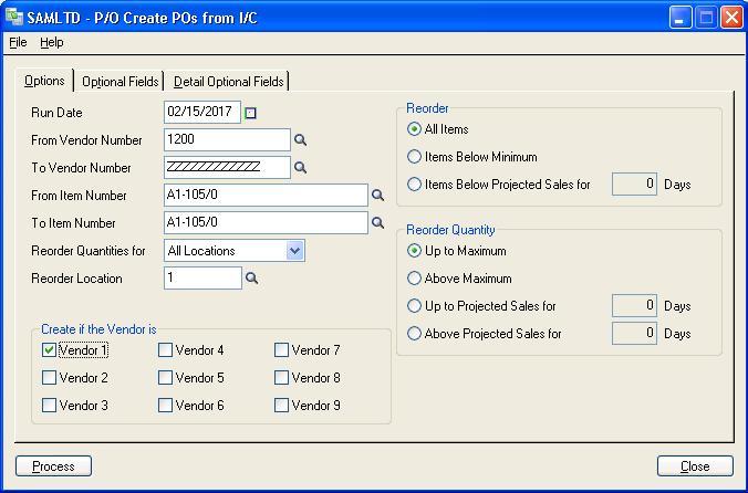 As you can see, Vendor 1 can supply item A1-105/0. Moving on to the Create POs from I/C screen now.