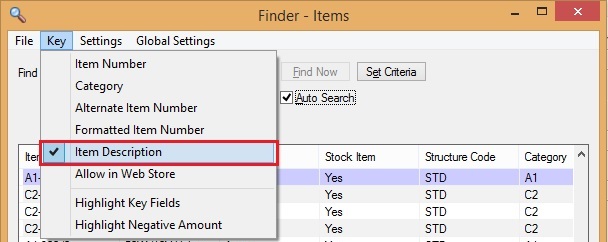 The finder control provides an option to sort the data displayed in the grid in the list of specified fields by Sage 300 ERP. The navigation for the sorting the records in the grid is Key → Select the required field for sorting from the top section of the menu.