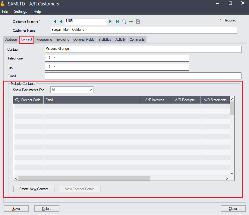 Go to AR Customer >> Open Customer Screen >> Select Any Customer >> click on Contact Tab.