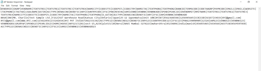Below is a sample screenshot of a text file containing vendor data that can be used for creating AP Vendor entries.