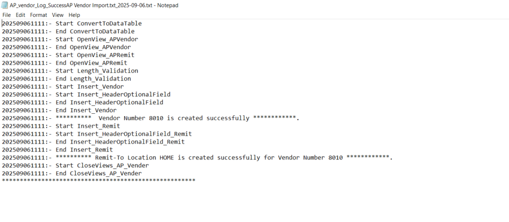 The text file will include all the mandatory fields required for creating an AP Vendor, such as Vendor Number, Vendor Name, Group Code, Address, Payment Code, Tax Group, etc. Along with these, users also have the flexibility to provide optional fields in the text file if needed.