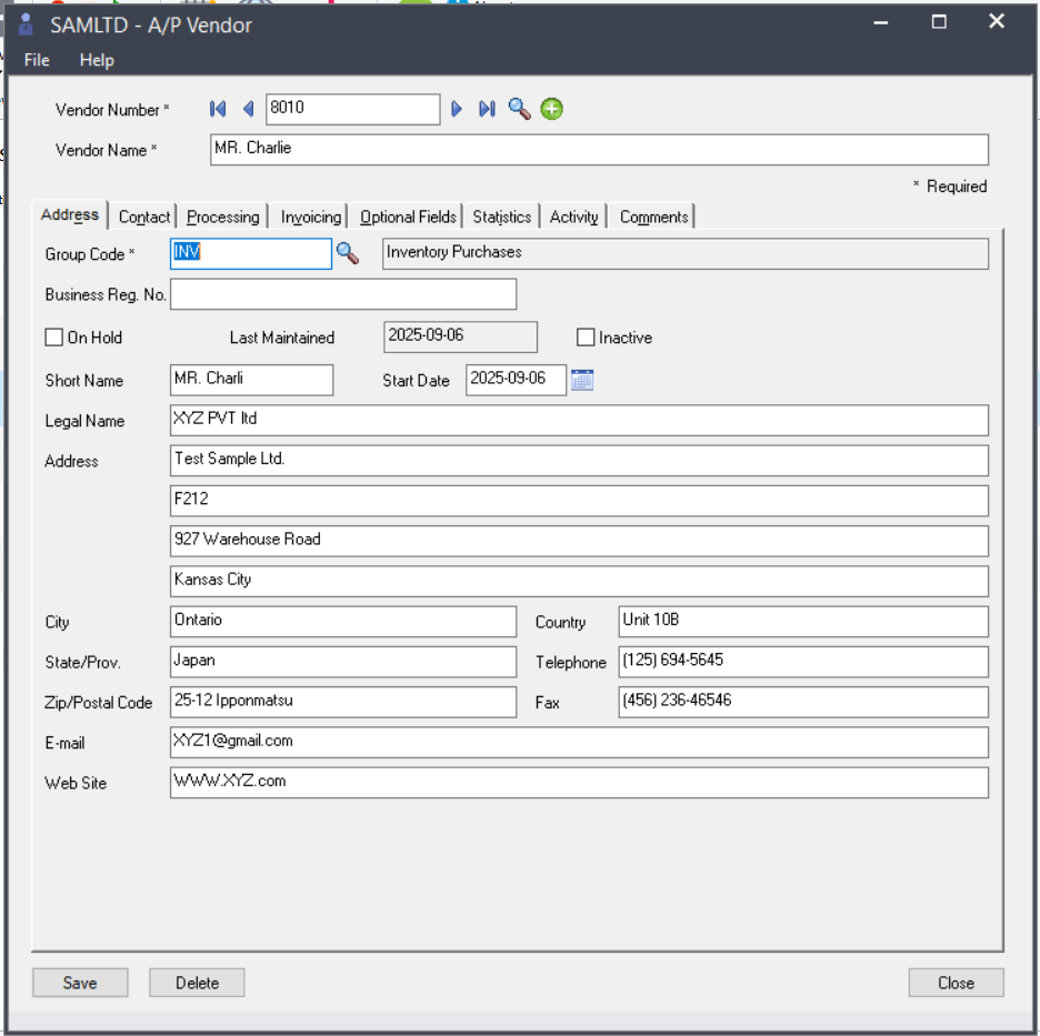 The AP Vendor creation in Sage is successfully completed, as displayed in the screenshot below.