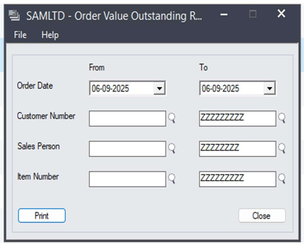 The generated report now includes the Salesperson column along with existing fields such as Customer Number, Item Number, Order Value, etc. Users can filter data using the updated parameters (Order Date, Customer Number, Salesperson, Item Number) to view customized results.