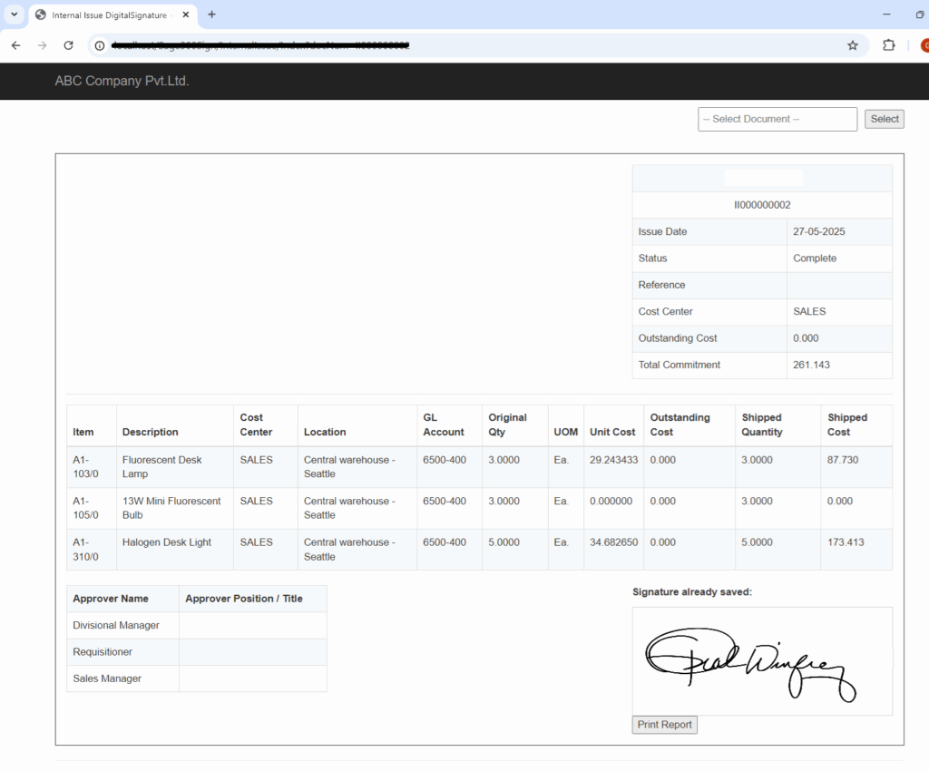 The signature is recorded against the chosen document in a secure format. - The signed document is added to the system’s records.