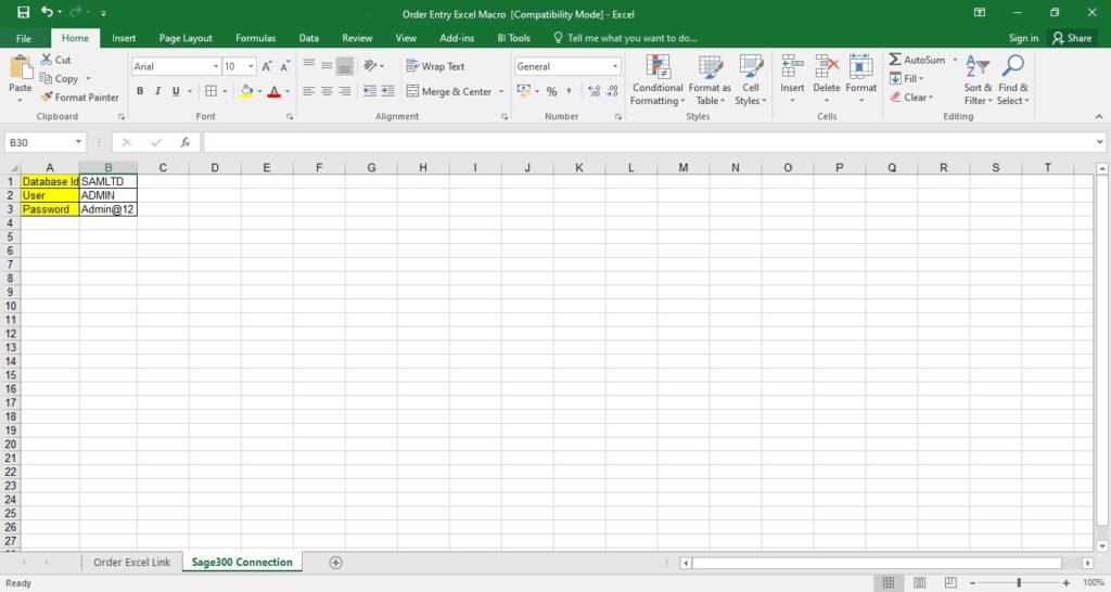 Sheet 2: In sheet 2 stores Sage 300 login credentials such as Database ID, Username, and Password.These two sheets together enable a complete Sales Order import process.