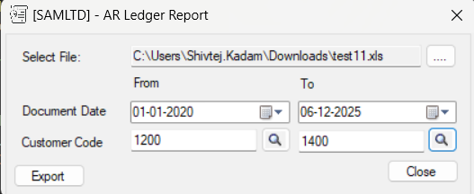The report will be exported in selected folder as an excel file-based format with parameter as of from & To Document Date, Item, Customer code.