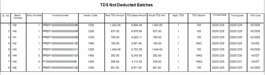 As shown in the above output, the report is generated successfully. It includes details such as batch number, entry number, invoice number, vendor number, and TDS-related information including TDS amount, TDS section, NOD, TDS posting status, and other relevant details.