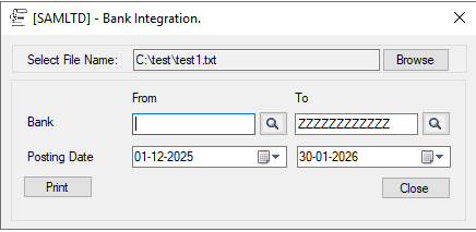 Building on this core workflow, the custom EXE extracts data directly from posted AP invoices and AP payments. The Exe provides user-defined filters such as Bank Code and Posting Date, ensuring that only the relevant transactions are selected for export. This allows users to generate output files specific to a particular bank and accounting period, which is essential for real-world banking and reconciliation processes.