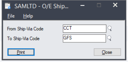 The OE Ship Via Code Screen Report allows users to generate a list of Ship Via codes defined in the system. The report is driven by a selection screen where users can specify a range of Ship Via codes to be printed, making it easy to review specific records or the entire setup.