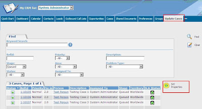 The search result will come in a grid format. Along with this there will also be a new button named “Set Properties”. Clicking on that will display an entry block for the properties (i.e. fields regarding to Cases Entity) such as Stage, Status, Assigned To that we want to update.