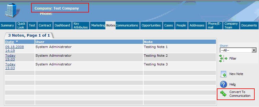 There are 3 notes with this company. When user will click on the “Convert To Communication” button; on a single click all 3 notes will get converted to communications for the Company named Test Company.