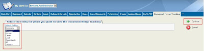 After istalling this component, you may see a new tab in the MY CRM area named “Document Merge Tracking” where you can see the drop down box to select any entity and then click Continue button for this tool to be enabled for an entity of your choice.
