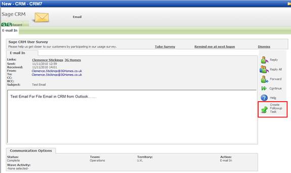 By this process the user does not have to login to Sage CRM and search for the company/person and then create a new tasks against the communication.