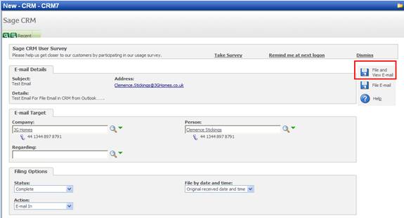 “File E-Mail” button just files an email in CRM against selected Person and Company. “File and View E-Mail” files an email and redirects user to the summary of that email created in CRM.