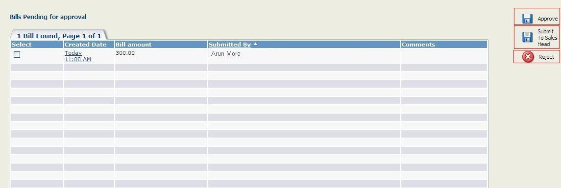 Regional Sales Head can either Approve, Reject claim or submit it to the Sales Head using the buttons on the right hand side as shown above. These actions can be done against multiple bills at a time using the checkboxes or we can also do them for single bill at a time from bill summary.
