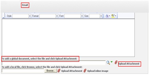 In standard CRM, when user clicks on “New Email” button there is functionality to attach all global documents, local documents and send mail. The below screen shot is for standard functionality in CRM.