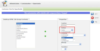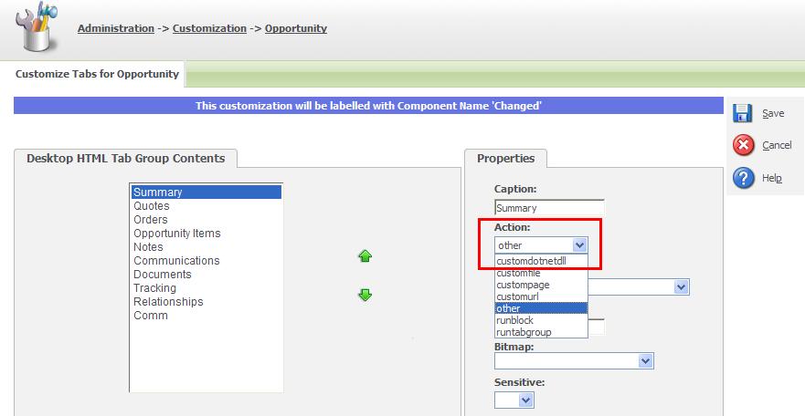 – Not able to get the “customdotnetdll” option in the “Action” at Tab level customization as: