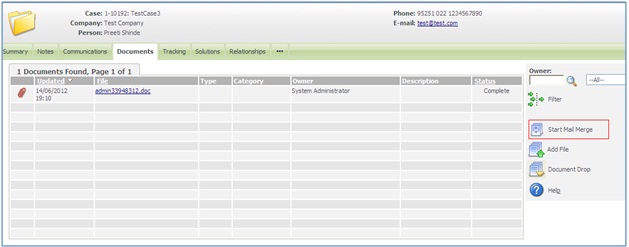 2. Or navigate to the context where you want to create a new template say for Case Entity, go to Documents Tab for the particular Case for which you want to create the template and Click on the Start Mail Merge Action button refer: