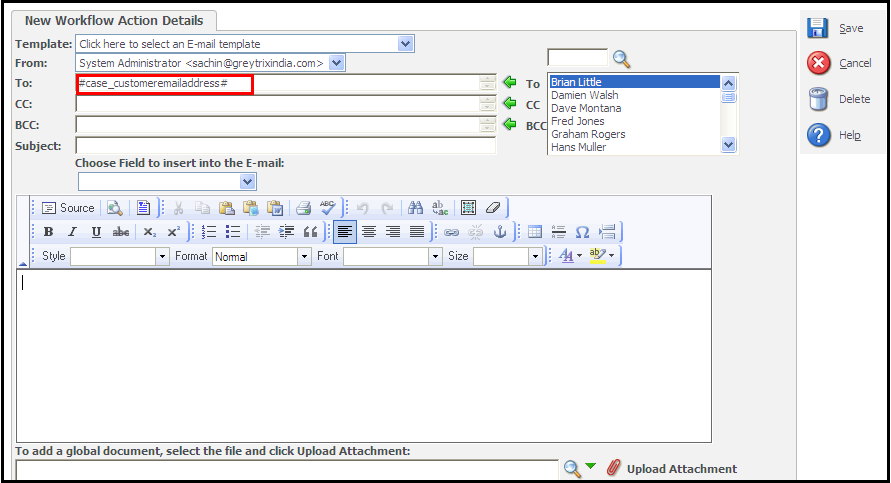 In Sage CRM, for creating the case there is standard workflow or we can create the new workflow as per our requirement also. Not only for cases, workflow can also be defined for other entities like opportunity, lead, etc. In workflow, there is one action as “Send E-mail”. This action is used to send emails through workflow.