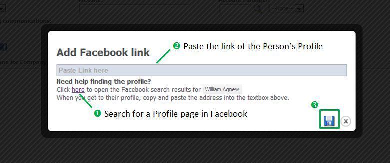 In the context of a Person in Sage CRM, you will see a new field “Facebook Profile” once the component has been installed. Select Change, and then click on the Facebook icon that appears to search for the Person’s profile page.