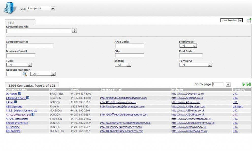 If you search for a company or person, Sage CRM will display a link to the company or person’s Facebook profile beside their name.